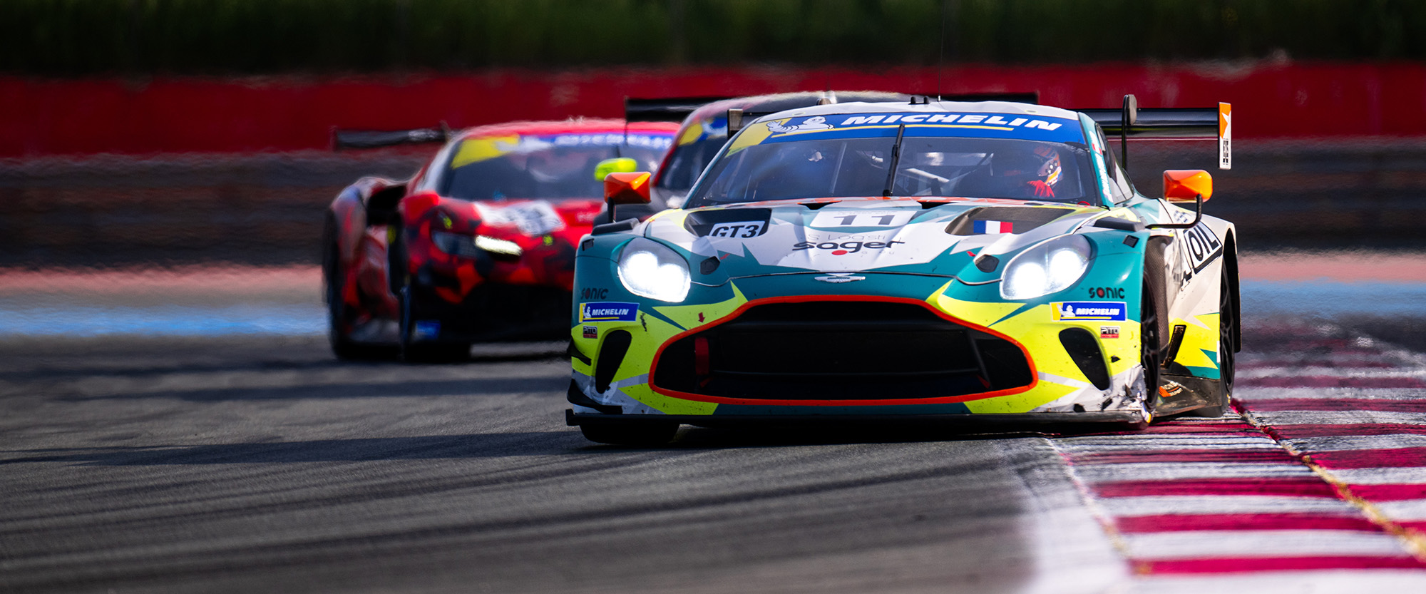 The GT3 class saw several changes of lead throughout the race but in the end the no11 Code Racing Development Aston Martin Vantage came through to secure the victory in Le Castellet, with Rory Van Der Steur passing the no17 Kessel Racing Ferrari of Andrea Belicchi in the final few laps of the race. Belicchi was also passed by Eliseo Donno in the no51 AF Corse Ferrari, with the top three cars covered by just 3.5 seconds after two hours of racing.