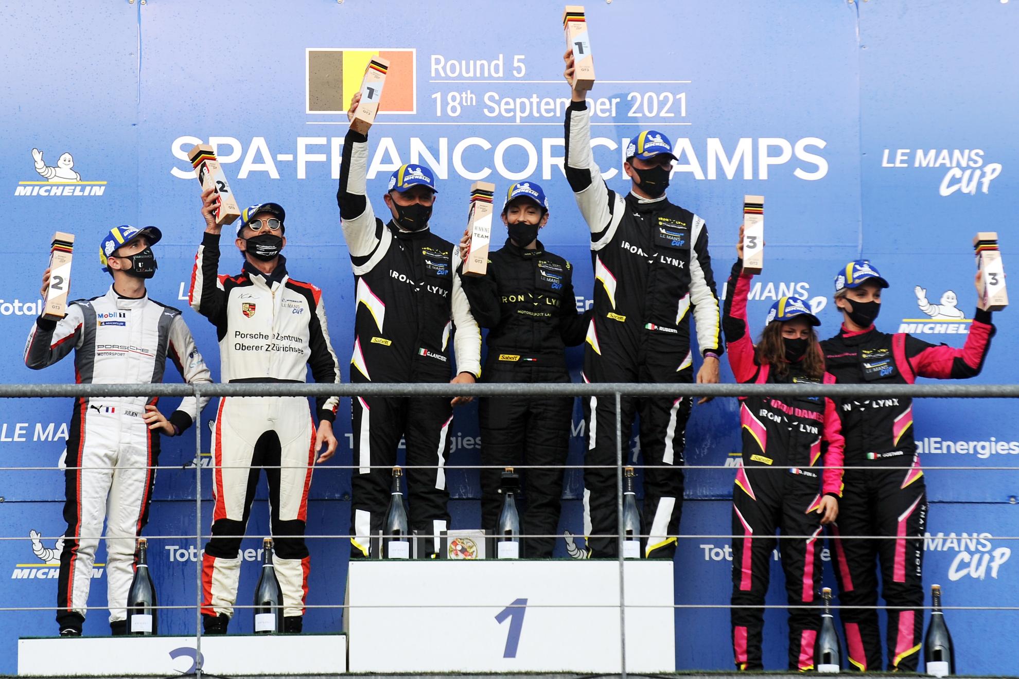 The no8 Iron Lynx Ferrari of Gabriele Lancieri and Paolo Ruberti took victory at Spa-Francorchamps to claim the coveted Michelin Le Mans Cup title for the Italian team and also the invitation to the 2022 24 Hours of Le Mans. With Nicolas Leutwiler and Julien Andlauer finishing second in the no2 Pzoberer Zürichsee by TFT Porsche 911 GT3 R, the drivers title is still up for grabs in Portugal next month.