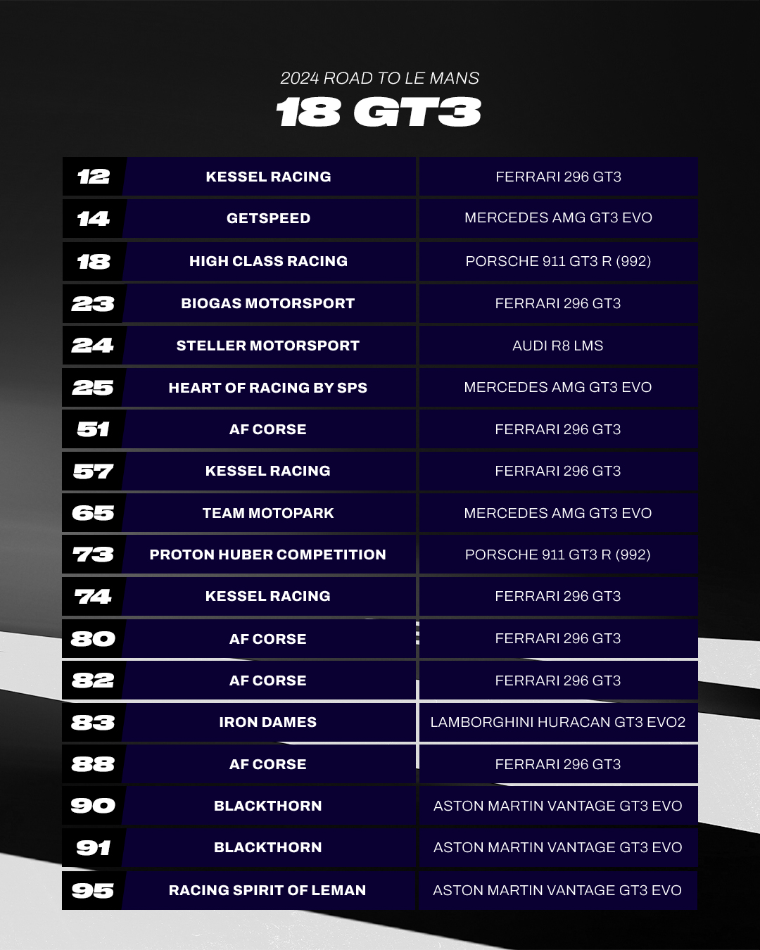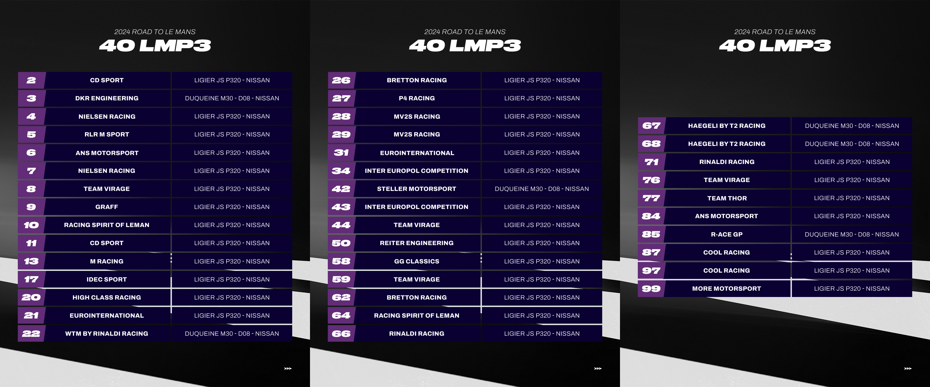 2022 LMP3 and 2023 GT3 Team Champions Racing Spirit of Léman return with an entry in each category. Other additional entries in LMP3 come courtesy of some of the other ELMS regulars with four-time MLMC champions DKR Engineering entering a single Duqueine, while 2021 team champions Nielsen Racing will field a second Ligier for Road to Le Mans.