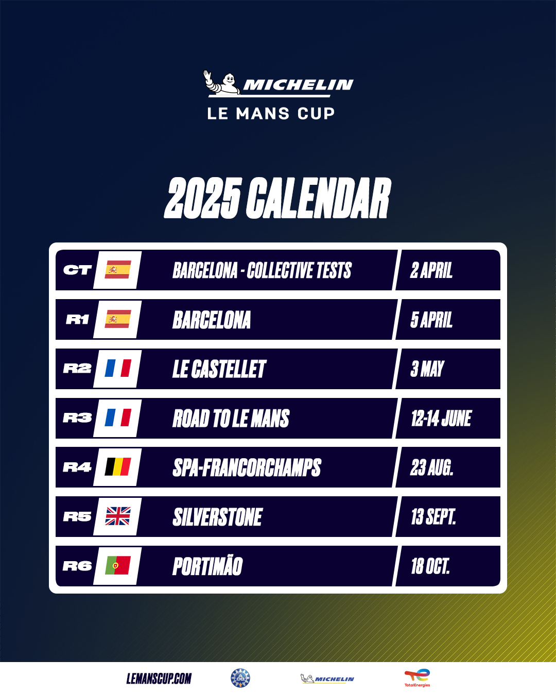 « Le calendrier 2025 inclura pour la première fois Silverstone, ce qui est une bonne nouvelle pour nos fans britanniques, ainsi que les toujours populaires rendez-vous de Barcelone, du Castellet, de Spa-Francorchamps, dePortimão et bien sûr du Mans. Nous sommes impatients de voir encore plus de compétition disputée en Michelin Le Mans Cup la saison prochaine. »